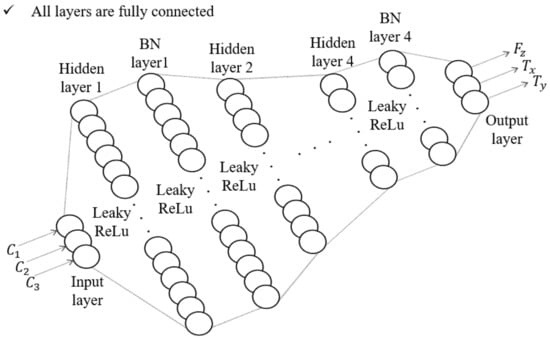 In general, to obtain accurate results for the sensor’s calibration process, a delicate experimental setup should be designed such that it can apply an independent force and torque to the developed and reference sensors simultaneously. Designing such a sophisticated experimental setup is expensive and time-consuming. Furthermore, this increases the cost of manufacturing sensors. However, through the deep neural network (DNN) calibration method [], relatively accurate calibration results can be obtained with combined force and torque. In addition, it was assumed that the deformation of the elastomer layer is a linear model in Equation (2). However, actual deformation is too complex by the nonlinearity, hysteresis, and relaxation effect of the elastomer layer. So, it is difficult to predict the change in capacitance with theoretically derived equations. Therefore, to find the relationship between force and capacitance, the DNN calibration method was adopted. Trough this method, the three-axis force/torque could be calculated from the change in the capacitance of the proposed sensor’s cells. As a result, to calibrate the proposed sensor, the DNN model shown in Figure 9 was designed. As shown in Figure 9, the normalized values of the three capacitance variations measured in the cell are input layers, and the sensor’s force and torque values are output layers. Four hidden layers and batch normalization (BN) layers are designed between the input and output layers. There are 180, 90, 60, and 30 number of nodes in each hidden layer. The activation function of the input and output layers is the linear function, and the activation function of the hidden layer is the Leaky ReLu function []. The Adam optimizer is used to train this model [], and the mean squared error is used as the loss function. The train loss and accuracy of this network model are measured as 0.003 and 0.95, respectively.