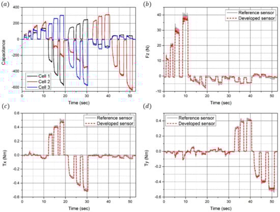 Calibration results. (a) Time domain responses of the capacitance change in the three sensing electrodes. (b) Time domain response of the z-direction force measured by the developed sensor (red dot) and the reference sensor (gray line). (c) Time domain response of the x-direction torque measured by the developed sensor and the reference sensor. (d) Time domain response of the y-direction torque measured by the developed sensor and the reference sensor.