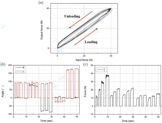 In order to analyze the hysteresis of the developed sensor, a constant force (40 N) was loaded/unloaded five times on the developed sensor in the experimental setup as shown in Figure 10b. As a result, hysteresis was found to be approximately 17.3%. As shown in Figure 12a, while the sensor shows some linearity when loading forces, this tends to decrease slowly when unloading owing to the residual stress in the elastomer layer. As shown in Figure 12b, with the measured data from Figure 11b–d, the two angles (, ) are estimated using Equations (9) and (10). As shown in Figure 12c, the magnitude of the applied forces () is calculated as follows: .