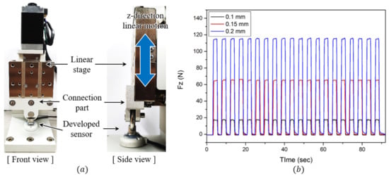 Next, as shown in Figure 13a, an experimental setup was designed to analyze the force repeatability of the developed sensor. It consists of a z-direction linear motorized stage (ZCV620-F-N, MISUMI), a developed sensor, and a connection part that connects the sensor with the stage, as shown in Figure 13b. In this experimental setup, the manufactured pin was caught between the eye-nut of the sensor and the connection part. Therefore, the linear stage and the developed sensor had the same Z-axis movement, which was measured using in the sensor. The linear motorized stage repeatedly moved 20 times at distances of 0.1 mm, 0.15 mm, and 0.2 mm. The time-domain responses of the sensor are shown in Figure 13c. In each case, the percentage errors are expressed based on the average of the measured forces as 1.32%, 1.48%, and 2.31%. As a result, the average repeatability of the force was analyzed as 1.75%. These results are summarized in Table 2.