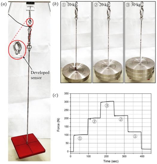 To analyze the capacity of the developed sensor, the experimental environment shown in Figure 14a was prepared so that the sensor could measure the weight of the mass disks. One mass disk weighs 10 kg, and the sensor measured the weight of a total of three disks in stages. Figure 14c shows the force data measured by the sensor as the disks are increased one by one to reach 30 kg and then reduced again. When loading a mass disk, it can be verified that the sensor measures the force with a relatively small error. However, when unloading a mass disk, it can be observed that the error increases by approximately 10 N. This is as a result of the compression set characteristics of the elastomer layer. When this layer is compressed, its thickness is not fully restored and remains reduced even after the compressive force is completely removed. Therefore, as a result of these characteristics, when the same weight was loaded on and unloaded from the sensor, the size of the gap between the cells and the ground of the sensor was not fully restored and remained reduced.