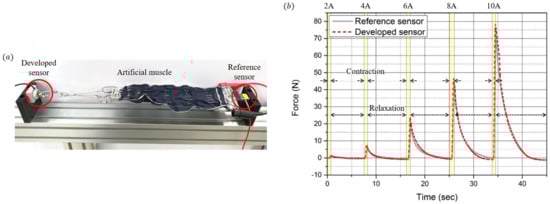 As shown in Figure 16a, the developed sensor and the reference sensor (FSH03878, FUTEK) were applied to both sides of the artificial muscle, and the force of the muscle was measured and analyzed using both sensors. Figure 16b shows the result of the force measured at both sensors. When a current of 2 A, 4 A, 6 A, 8 A, and 10 A is applied to the artificial muscle, the artificial muscle contracts, and when no current is applied, the artificial muscle relaxes. The maximum contraction force of the artificial muscle is approximately 80 N, which is sufficiently measurable using the developed sensor. Comparing the contraction and relaxation phases, it can be seen that a large difference occurs during the relaxation phase. According to the previous hysteresis analysis, the force tends to decrease relatively slowly owing to the residual stress of the elastomer layer when the force is unloaded. The relative error of the reference sensor is 2.37%, similar to the one analyzed earlier. Below a force of 100 N, the compression set characteristic is not manifested. Therefore, the error is smaller than that in the previous high-load experiment.