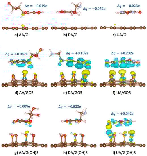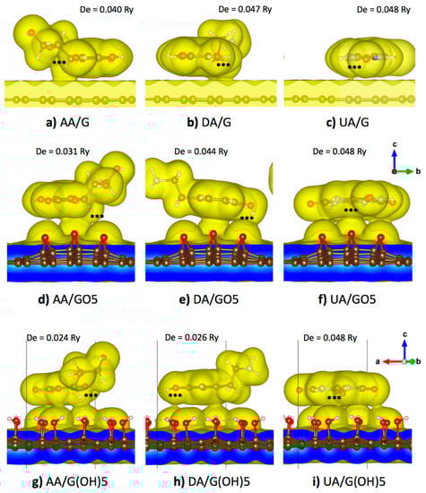 3.3. Binding Configurations and Binding Strengths of AA/UA/DA on Graphene and GOs