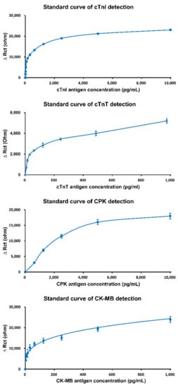 ® biosensor chips were modified with anti-cTnI, cTnT, CK-MB, and CPK antibodies, respectively. We conducted electrochemical impedance spectroscopy (EIS) measurements to determine the reproducibility and accuracy. Let us take cTnI as an example. The CV of the charge transfer resistance
