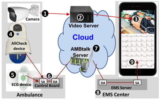 Figure 4 (9)). The AMBtalk server is deployed at the EMS center or in the cloud, and is connected to the EMS server through Ethernet wired communications. An ambulance control board is installed in the ambulance and is connected to the AMBtalk server through 4G LTE or 5G wireless communications.