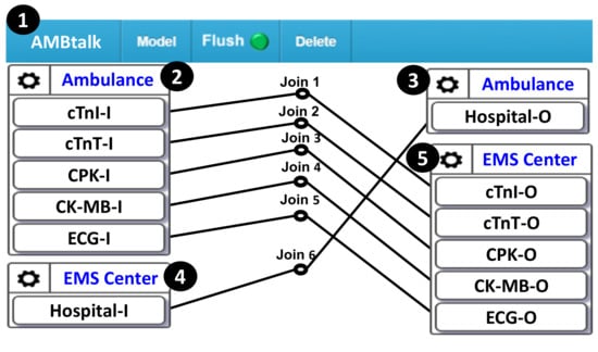Figure 4 (6)), which receives the measured cardiovascular and the ECG data from the control board and puts them in five variables, i.e., cTnI-I, cTnT-I, CPK-I, CK-MB-I, and ECG-I, to be sent to the AMBtalk server. Another icon “EMS Center” (