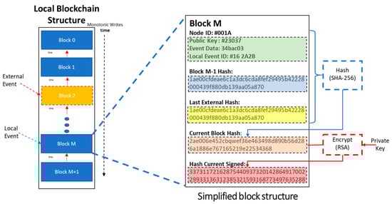In addition, most IoT devices lack a real-time clock. In the proposed Witness Protocol, time is defined relatively. Events from neighboring devices (External Events) are stored in the hash chain along with events that take place locally (Local Events). Each event taking place in a device (node) is monotonically recorded and acts as a relative timestamp to the local chains of the receiving nodes. The entire micro-blockchain can then be seen as the construct (aggregate) of the collective memory of all nodes, depicted in Figure 2: