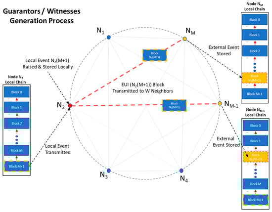 In our ground-base scenario, N autonomous, peer, IoT microcontrollers operating in a Neighborhood of peer devices are forming the micro-blockchain, providing the conceptual framework to our study. The objective of the chain is to provide with a robust “Witness/Guarantor” mechanism: Upon the advent of a local event (e.g., a door unlocking), W randomly picked neighbors are becoming potential “external” witnesses.