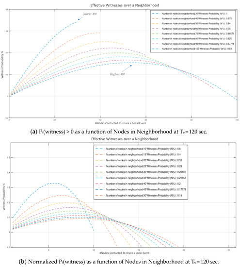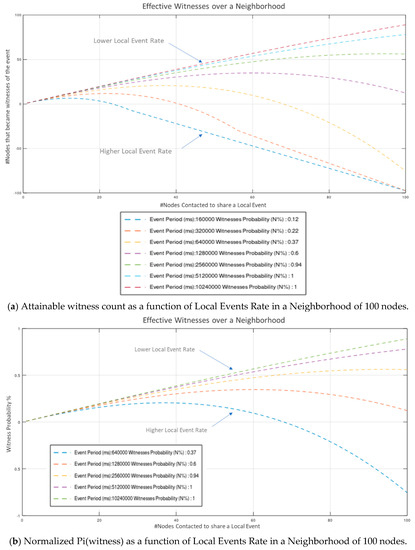 For a “fair”, human-timescale average of 120 s (period of new local events on each peer node), the normalized probability of W nodes effectively witnessing an event ( is depicted on Figure 10a,b s as a function of the neighborhood population respectively.
