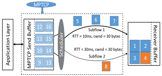 As mentioned above, scheduler is another important part that greatly influences MPTCP performance. Generally, a scheduler has to consider two main constraints, namely, head-of-line (HoL) blocking [64] and receive-window limitations. Round-Robin (RR) and Lowest-RTT-First (LowRTT) [65] are well-used schedulers. The RR scheduler distributes packets through every active path in a circular order, regardless of whether there are severe latency differences among different paths. On the other hand, to mitigate the effects of delay difference in heterogeneous networks, LowRTT prioritizes fast flows then relatively slow flows until the congestion window is filled up. For example, as shown in Figure 3, the MPTCP scheduler sends three packets on the fast subflow 1 while only sending one on the slow subflow 2.