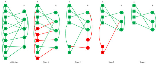 To perform the cascading failure in a ‘one-to-multiple correspondence’ model, some nodes’ connection of the simulation model is illustrated in Figure 2. The relationship between intra-links and inter-links is illustrated in the figure’s initial stage. When the cascading failure ends, the connection of the system is depicted in stage 4.