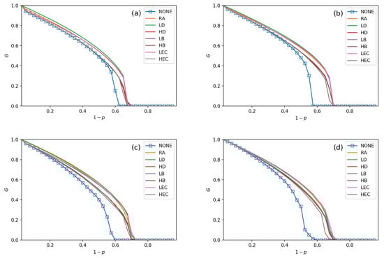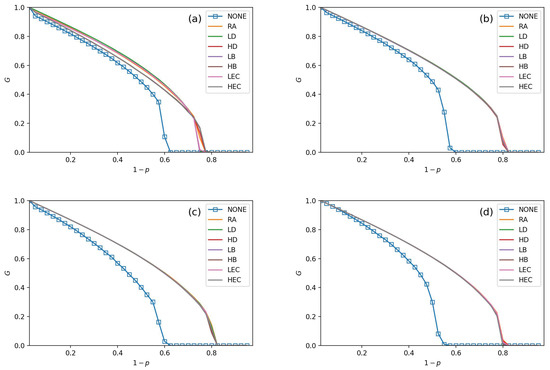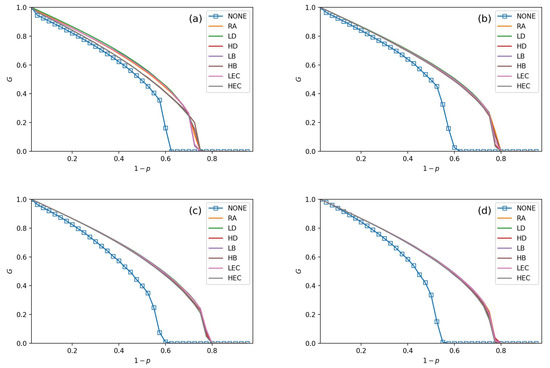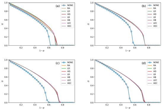 Seven adding strategies are applied in models to verify the performance of the CPS. In Figure 3, Figure 4, Figure 5 and Figure 6, the values of are setting as 15%, 25%, 35%, and 45%, respectively. In each subfigure, we plot relationships of G, and . Then, we plot not adding links (NONE) as a contrast simulation for the other strategies which are detailed in Section 3. From the Figure 3, Figure 4, Figure 5 and Figure 6, we get the following conclusions: