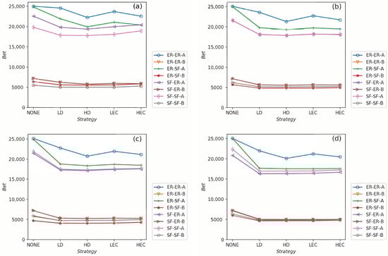 Figure 7. The values of betweenness centrality values in systems when , , and are shown in (a–d), respectively.