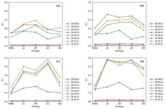 Figure 8. The values of eigenvector centrality values in systems when , , and are shown in (a–d), respectively. - In Figure 7, we graph the relationship of betweenness values and different strategies. We use the form X-Y-Z to illustrate the interdependent networks after adding intra-links [28]. X and Y denote the types of the network of interdependent networks. Z represents the single network of the CPS. We find that the betweenness values of strategies are lower than the original networks (NONE). Gaps between betweennesses among ER-SF, SF-ER, and SF-SF interdependent networks are getting smaller when increases. The betweenness values of the A network in the ER-ER model are highest under all .In Figure 8, we plot the eigenvector centrality values of different strategies. Eigenvector centrality values of LEC are lower than the other strategies when . When , and , HD and HEC display a tendency to decay compared to their adjacent values. All strategies’ eigenvector centrality values are more closed with getting bigger. The eigenvector centrality values of the A network are smaller than its correspondence B network. The ER network has higher eigenvector centrality values. In Figure 8, the eigenvector centrality values of all strategies are not lower than NONE.According to Figure 7 and Figure 8, we can obtain that decreasing the network’s betweenness value and increasing the network’s eigenvector centrality value could enhance network reliability. Nevertheless, a too high or too low cost cannot get the largest G and . Betweenness values and eigenvector centrality values of different interdependent networks are not the same, even if their topologies are similar.