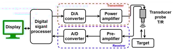 3]. The input signal in an ultrasound system is amplified through the power amplifier in the ultrasound (ultrasonic) transmitter. The output signal of the transmitter vibrates the piezoelectric element of the transducer probe to transmit ultrasonic waves [