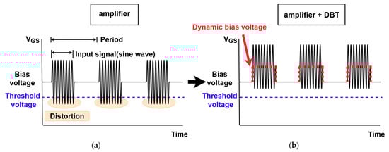 Figure 9b shows the measured power gain and PAE of the amplifier and amplifier using DBT. The input signal was measured using a 20-MHz, 1000-cycle burst wave. For the amplifier using DBT, the bias voltage level increases when the input signal is applied; thus, there is less distortion of the input signal, and more current can flow from the drain to source. Additionally, when the static bias voltage increases, a large amount of DC power is consumed owing to the widened drain–source channel in the active device; thus, the PAE can be decreased accordingly. However, the PAE can be improved when an output with high amplitude is formed, and the DC power is minimized by applying a dynamic bias voltage that increases the bias voltage only when the input signal is present. (see