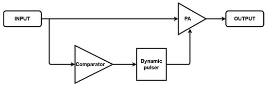 Figure 3 shows the amplification process based on the dynamic bias technique. When an input signal is applied, a logic high signal is produced through the comparator. The dynamic pulser calculates the time delay and pulse width when the logic high signal arrives, and a pulse signal is applied to the gate of the active device in the power amplifier. In a dynamic pulser, custom tuning can be performed over wider frequency ranges in the microcontroller unit (MCU). The electrical elements used for the comparator, dynamic pulser, and power amplifier must be properly tuned to be used for some transducers while considering the frequency and amplitude characteristics.