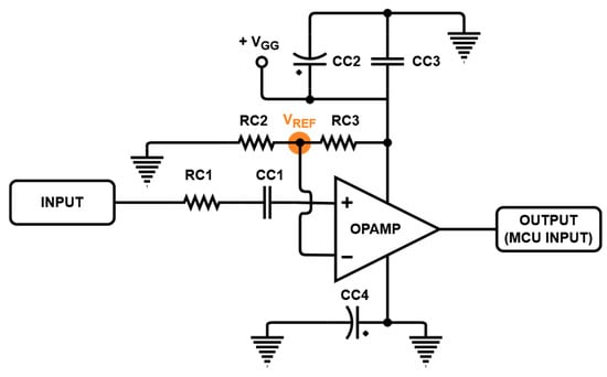 Figure 3. The comparator was constructed using the operational amplifier (OPA847, Texas Instrument Inc., Dallas, TX, USA). The voltage swing of the input signal may be lower than the trigger voltage of the MCU. In this case, the MCU does not detect the input signal so it cannot be performed as digital logic. Therefore, a comparator was composed with the operational amplifier. Because the input impedance of the operational amplifier (OPAMP) is very low, the amplitude of the input signal is distributed between the power amplifier and comparator, and the input signal applied to the gate in the power amplifier can be lowered. Additionally, the pulse signal from the dynamic pulser has certain frequency characteristics, and a feedback route can be formed through the capacitor to block the DC signal used in the amplifier; thus, the distributed signal is minimized and the feedback route is blocked by using CC1 and high values of RC1. RC2 and RC3 are appropriately selected to have the reference voltage V