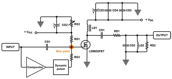 41]. Therefore, resistors, rather than capacitors or inductors, were used to prevent static bias voltages from the function generator or comparator. The bias voltage is generated with RG1, RG2, RG3, and internal resistances of the LDMOSFET and MCU. The output (GPIO) of the dynamic pulser is connected through RG3. The An electrolytic capacitor (CD3) and ceramic capacitors (CD4 and CD5) were used to provide stable voltages to the drain of the LDMOSFET. A choke coil inductor (LD1) and CD1 were used to couple and block the signals. Additionally, RD1, RD2, CD2, and LD2 were appropriately adjusted to be compatible with a 20 MHz transducer [
