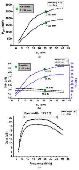 Figure 9c, the bandwidth of the designed amplifier only and the amplifier with DBT had the same bandwidth as 143.5%. Expectedly, a higher output, power gain, and PAE can be obtained. When comparing the data between Amp + DBT and Amp in