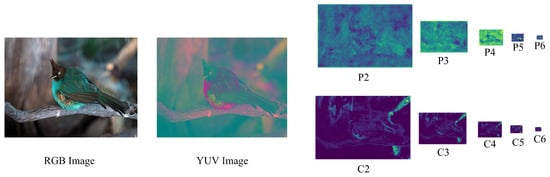 We select Faster R-CNN+FPN as the baseline and compare the AP of the object detection network with/without color priors on the VOC datasets in order to verify the effectiveness of the color prior model. Faster R-CNN selects ResNet-101 to extract the basic features of the input image, and it uses FPN to construct high-level semantic features at various scales. FPN adopts a top-down hierarchical structure with side links. The advantage is that it can make reasonable use of the inherent multi-scale and hierarchical structure of deep convolutional networks, so that features at different scales have strong semantic information. Through CNN+FPN, the test image obtains multiple feature layers, namely , and it generates saliency maps through the color prior model. The acquired saliency maps are then pooled into the corresponding multiple hierarchical features namely through the image pyramid technique (the feature maps are illustrated in Figure 4). The two sets of features are spliced and input into the detection head RPN for the subsequent detection modules.