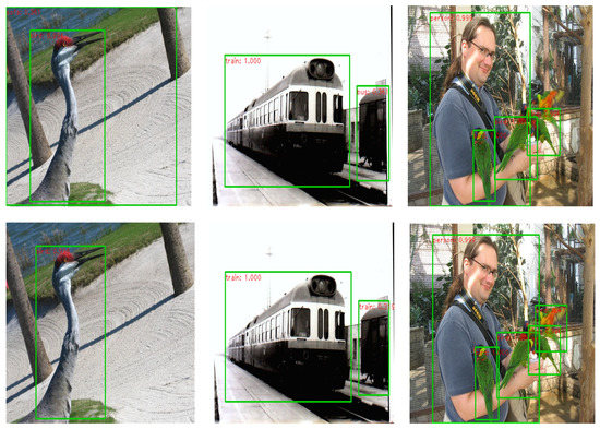 Figure 5 shows the result images of the benchmark algorithm and the proposed algorithm in a typical experiment of object detection. It can be seen from the figure that the benchmark algorithm has an error detection (left column in Figure 5), class error (middle column in Figure 5), and missed detection (right column in Figure 5). However, the object to be detected still has certain color characteristics, and the correct detection result can be obtained by combining the color prior model, which proves that the cognitive-driven color prior model can enhance the performance of the target detection algorithm.
