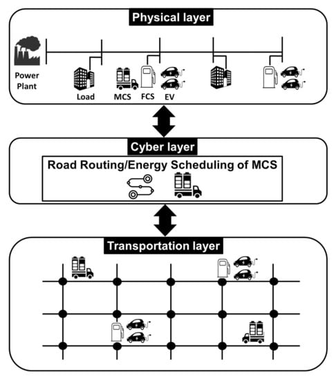 The primary goal of this study is to present a more practical MCS optimization algorithm that can be implemented in realistic operation conditions of power distribution systems. As shown in Figure 1, the proposed algorithm is executed in a cyber-physical transportation system (CPTS) with three layers, corresponding to (i) a computing, communication, and control entity in the cyber layer; (ii) a power distribution system in the physical layer; and (iii) a road network in the transportation layer. Given a tighter coupling between the transportation system and the power distribution system [4], the primary goal of our study was to develop an optimization framework in the cyber layer that calculates the schedule of the road routing in the transportation layer and the schedule of energy charging/discharging of the MCSs in the physical layer. In the CPTS, the proposed algorithm allows the MCSs to be quickly dispatched to the desired FCSs to reduce the number of waiting EVs and maintain the normal voltage level along the power distribution feeder in real operation conditions of the distribution system. Specifically, the main contributions of this study are two-fold: