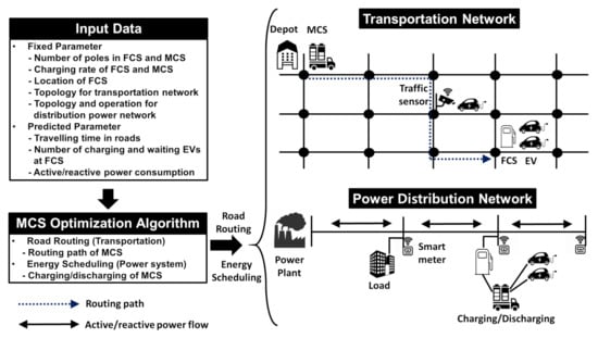 As shown in Figure 2, the proposed MCS optimization algorithm executes the following two tasks simultaneously: (1) road routing scheduling of the MCS in the transportation network and (2) active and reactive power charging/discharging scheduling of the MCS in the power distribution network. Given the aforementioned input data, the first task of the proposed approach is to calculate an optimal path schedule through which the MCSs are dispatched to the desired FCSs to minimize the number of waiting EVs at the FCS. The second task of the proposed algorithm is to conduct an optimal scheduling of the MCS charging from the power grid and MCS discharging to the waiting EVs at the FCS and the power grid while ensuring a normal voltage profile.