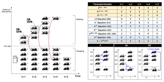 Figure 3 illustrates an example of the proposed EV queue dynamics at FCS associated with the MCS operation. We assume that there are no EVs leaving the queue without charging. In this figure, the table provides the values of parameters and variables during the five scheduling periods. These parameters and variables are used in the constraints of EV queue dynamics. The results from the second to fourth rows in this table represent the values of the parameters for the number of EVs, charging EVs, and waiting EVs, respectively. The results from the fifth to tenth rows were obtained using the constraints in Equations (20)–(26). The last row of the table denotes the total number of EVs at the FCS, which is the sum of the charging and waiting EVs. A key part of the EV queue dynamics is the calculation of the number of decreased waiting EVs (). The image at the bottom right corner in Figure 3 illustrates the impact of on the number of charging and waiting EVs. This impact is categorized into three cases (Cases A, B1, and B2). In these three cases, we assume that three EVs (EV1, EV2, and EV3) and three EVs (EV2, EV3, and EV4) wait at times and t, respectively. We consider the situation in which three EVs are removed at times owing to MCS discharging. In Case A, EV2 and EV3 are already removed at time ; therefore, EV2 and EV3 in the waiting queue at time t are removed as well. Cases B1 and B2 include the scenario where a waiting EV at time charges power at the FCS at time t. In Case B1, given that EV1 was already removed at time , EV1 is also removed from the charging queue at time t. In Case B2, EV4 moves from the waiting queue to the charging queue and starts charging at time t through the charging pole that is allocated to the removed EV1 in Case B1. As a result, EV2, EV3, and EV4 are removed at time t in Cases A, B1, and B2 ( = 3). Finally, the inset on the left side in Figure 3 shows the charging and waiting EV queue dynamics based on the results associated with those listed in the table and the three aforementioned cases.