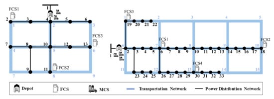 We consider a situation in which multiple MCSs are dispatched to multiple FCSs through a transportation network for charging EVs that wait at FCSs in a power distribution network. We assume that each MCS is a truck-mounted EV equipped with a utility-scale ESS. There are two types of nodes: (i) the set of nodes in the transportation network and (ii) the set of buses in the power distribution network. In this study, nodes and buses are denoted by the beginning and ending points in the transportation and power distribution networks, respectively. Depending on whether the FCSs are connected to the nodes and buses in the transportation and power distribution networks, the sets and are decomposed into the following two subsets: and . Given that the FCSs are located at the intersections of the transportation and power distribution networks, the set is equal to the set . and represent the set of MCSs and MCS scheduling periods, respectively. The number of elements in a set is denoted by .