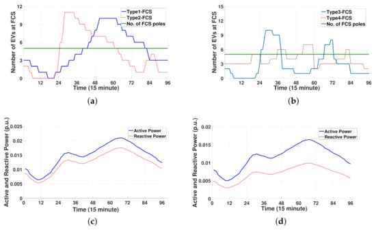 In this section, we quantify the performance of the proposed MCS control approach in IEEE 13-bus and 33-bus power distribution systems [25] coupled with 9-node and 15-node transportation systems, respectively, as shown in Figure 4. The simulations were executed for 24 h with a 15 min scheduling resolution (i.e., min). Consequently, the total number of scheduling time slots was . In the two power distribution systems, the base MVA was set to 100 MVA. Each FCS and MCS had five CPs () and two CPs (), respectively. According to different charging scheduling periods at FCSs, there were four types of FCSs: (i) Type1-FCS with public charger, (ii) Type2-FCS with work charger, (iii) Type3-FCS with public charger, and (iv) Type4-FCS with public charger. In the IEEE 13-bus distribution system with a 9-node transportation system, the depot with two MCSs (MCS1 and MCS2) was located at bus 4. Three FCSs (FCS1∼FCS3) were connected to buses 2, 11, and 13, respectively. FCS1 and FCS2 belong to Type1-FCS, whereas FCS3 belongs to Type2-FCS. In the IEEE 33-bus distribution system with a 15-node transportation system, the depot with three MCSs (MCS1, MCS2, and MCS3) was located at bus 2. Four FCSs (FCS1∼FCS4) were connected to buses 6, 18, 19, and 30, respectively. FCS1, FCS2, FCS3, and FCS4 correspond to Type1-FCS, Type2-FCS, Type3-FCS, and Type4-FCS, respectively. Figure 5a,b shows the predicted number of EVs () at Type1-FCS, Type2-FCS, Type3-FCS, and Type4-FCS prior to MCS dispatch, which was calculated from the results in [26]. In Figure 5a,b, the positive gap between the predicted number of EVs and the number of FCS poles represents the number of waiting EVs. The charging power rate of the FCS at bus b was 125 kW and the power factor of the EV load at the FCS was 0.95. The total active () and reactive power consumption () for non-EV loads in the IEEE 13-bus and 33-bus power distribution systems are illustrated in Figure 5c,d, respectively.