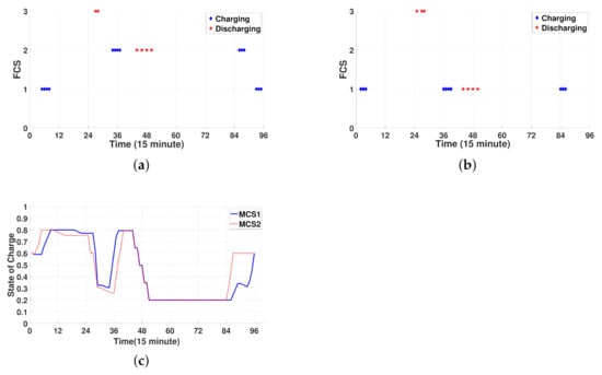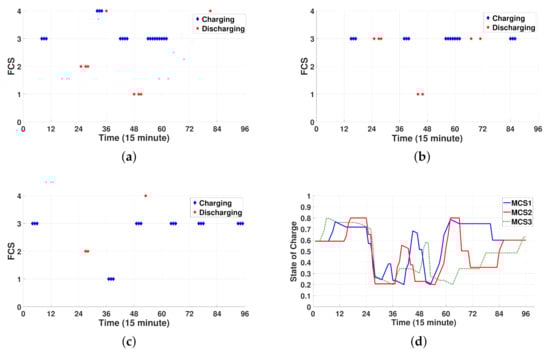 Figure 12a–d shows the operating schedule of three MCSs for 24 h. Note from Figure 12a–c that three MCSs visit FCSs for charging and discharging via the following routes: (i) FCS3→FCS2→FCS4→FCS3→FCS1→FCS3→FCS4 for MCS1, (ii) FCS3→FCS1→ FCS3 for MCS2, and (iii) FCS3→FCS2→FCS1→FCS3→FCS4→FCS3 for MCS3. Figure 12d shows the SOC schedule for three MCSs for 24 h, which is consistent with the results in Figure 12a–c. That is, the charging and discharging processes correspond to the increase and decrease in the SOC, respectively. In addition, the SOC curve for traveling is verified to decrease at a slower rate than the SOC curve for discharging. Furthermore, note from Figure 12d that three MCSs can maintain the desired SOC level () at the last scheduling period to return to the depot successfully.