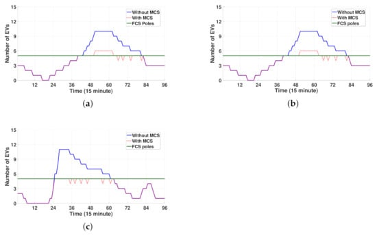 Comparison of the number of EVs without and with MCS between three FCSs. (a) FCS1. (b) FCS2. (c) FCS3.
