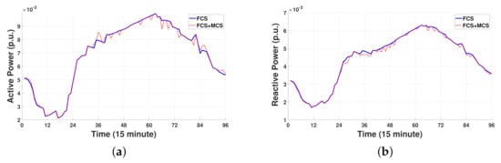 Figure 8a,b shows the total sum of active and reactive power consumption for three FCSs without and with MCSs during 24 h. Note from Figure 8a that, in general, the total active power consumption at FCSs with MCSs is less than or equal to the total active power consumption at FCSs without MCSs. This reduction in active power consumption at the FCSs is associated with a reduction in waiting EVs owing to the MCS power supply. However, as shown in Figure 8a, the total active power consumption at FCSs with MCSs is larger than the total active power consumption at FCSs without MCSs in the following three scheduling periods: 9:00 a.m., 9:00 p.m., and 12:00 a.m. These scheduling periods are consistent with the charging periods of the MCSs when the MCSs charge power from the grid through the remaining port of the FCS for discharging power to the waiting EVs or keeping the SOC level with which the MCSs can return to the depot. By contrast, note from Figure 8b that the total reactive power consumption at FCSs with MCSs is less than or equal to the total reactive power consumption at FCSs without MCSs. This observation is derived from the fact that the amount of reactive power injection of the MCSs into the grid becomes larger than the amount of reactive power absorption of the MCSs from the grid to achieve the normal voltage level.