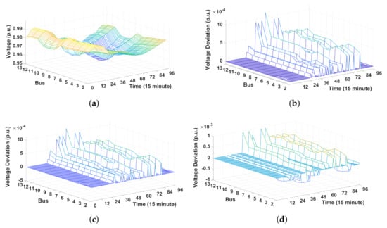 Figure 9a–d shows the voltage profiles and voltage deviation for 32 buses during a 24 h period. Given that the voltage magnitude at bus 1 is fixed at 1 p.u., it is omitted in these figures. Here, the voltage deviation represents the gap between the voltage magnitudes with and without MCS. Therefore, a positive voltage deviation implies that the MCS can mitigate lower voltage limit violations by increasing the voltage magnitude through the injection of reactive power into the grid. Figure 9a shows the voltage magnitude results including the MCSs where the voltage magnitudes are maintained within the lower half of the allowable voltage range [0.95 p.u., 1.05 p.u.]. Figure 9b–d shows voltage deviations due to the MCS operation in terms of weights in the multi-objective function (1). By comparing the results between these three figures, we observe that the voltage deviation increases as the weight for the voltage deviation from voltage magnitude reference increases. This observation implies that a higher allows the voltage magnitude to become higher and closer to 1 p.u., thereby preventing the violation of voltage at the lowest level with 0.95 p.u.