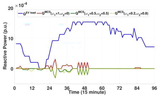 Reactive power consumption schedule for EVs and MCSs with different weights.