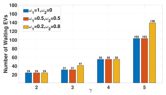 Note first from this figure that the number of waiting EVs can decrease significantly for the three cases after the MCS dispatch. Note also that a larger weight results in a smaller number of waiting EVs owing to the greater importance given to the reduction of waiting EVs in the objective function. By comparing Cases 1 and 2, we verify that as the number of FCSs increases with the same number of MCSs, the number of waiting EVs increases as well. The impact of the number of MCSs on the reduction of waiting EVs was investigated by comparing Cases 2 and 3. Note from Figure 16 that, under the situation with the same number of FCSs, an increasing number of MCSs can lead to a significant reduction in the number of waiting EVs.