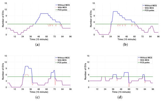Comparison of the number of EVs without and with MCS between four FCSs. (a) FCS1. (b) FCS2. (c) FCS3. (d) FCS4.