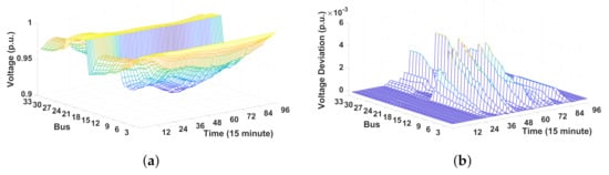 Voltage profile and voltage deviation for 32 buses during 24 h. (a) Voltage magnitude after the MCS dispatch. (b) Voltage deviation (, ).
