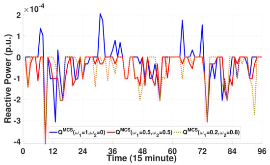 Total reactive power consumption scheduled for three MCSs with different weights.