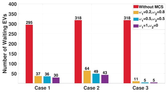 Comparison of the total number of waiting EVs with and without MCS in terms of different weights for three cases.