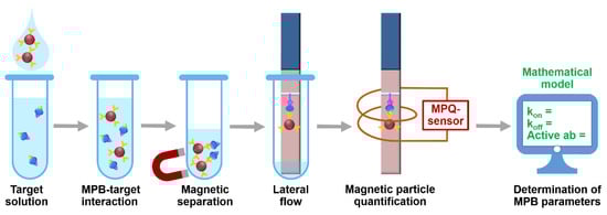 The setup (Figure 1) realizes the following procedure. At first, MPB with immobilized biorecognition molecules, e.g., antibody, are added to a target-containing sample. During the subsequent incubation, some MPB form complexes with the target. The other MPB may remain unbound. At the second step, both bound and non-bound MPB are isolated from the sample by magnetic separation with a permanent magnet. The separated MPB are deposited onto a lateral flow strip and migrate along it due to capillary forces. Then the MPB-target complexes are entrapped at a pre-deposited test line made of, e.g., antibody to another epitope of the target. The unbound MPB do not interact with the TL and continue migrating to the absorbent pad of the LF strip. Finally, the LF strip is positioned inside a sensing coil of the MPQ sensor for accurate quantification of MPB at the TL. To determine characteristics of MPB binding with the target, we use a mathematical model described below.