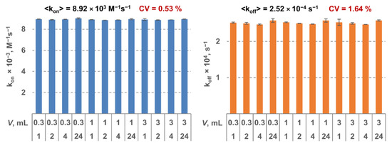 Kinetic constants kon (on the left) and koff (on the right) determined for staphylococcal enterotoxin B (SEB) as a model target using the proposed method at various values of sample volume and interaction duration.
