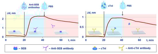 A solution of 20 μg/mL of free (non-immobilized) antibody against either cTnI or SEB in PBS-BSA buffer was pumped along the sensor chip surface with the immobilized target for 15 min at a flow rate of 10 μL/min in the liquid handling system of SCI biosensor followed by pumping of PBS buffer. The sensograms of target binding were recorded by the SCI-biosensors in real time as temporal dependences of the biolayer thickness on the sensor chip surface. The kinetic constants of interactions were calculated using the Langmuir model.
