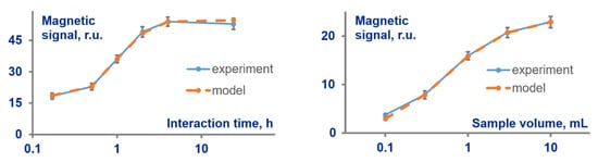 Another advantage of the developed method is its capacity to provide an accurate prognostic description of MPB interaction with target and predict its dynamics. We have demonstrated this feature by determining the number of MPB-target complexes depending on duration t of MPB-target interaction and sample volume V. To find the prognostic meaning for any arbitrary t and V, one should substitute into Equation (8) the values of kinetic constants and N obtained as described in Section 3.3. Figure 4 exhibits in orange color the predicted dependences of the complexes quantities upon (i) t in the range of 30 min—24 h, and (ii) V in the range (0.1–10) mL. This figure also shows in blue color the experimentally obtained, MPQ-measured values of MPB trapped at the test line after interaction with target under respective meanings of t and V. As can be seen from the figure, the theoretical and experimental values are the same within the experimental error throughout the whole wide ranges of t and V. This fact suggests exceptional reliability of the method and verifies its suitability for accurate characterization of MPB–target interactions.