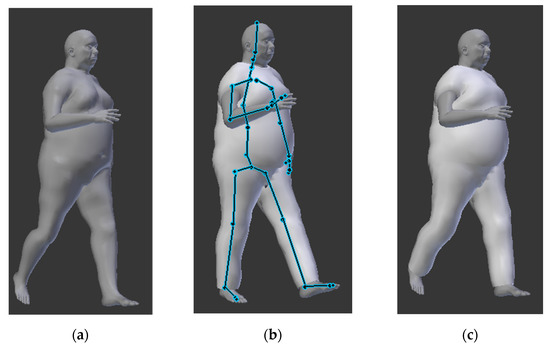 Kinematic model in Blender ((a) statistical body shape model, (b) parenting of the mesh with the armature, (c) rigging of the statistical shape model with the cloth and the bvh file).