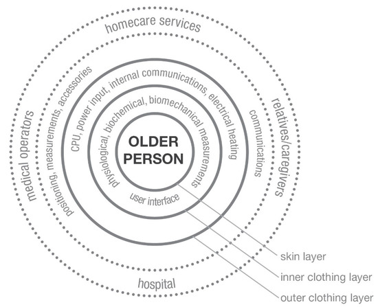 The interaction between layer and border can be active (sensoric, adaptive, self-healing) or passive (as a barrier against cold, rain, and wind). In fact, according to the conceptual model of Ranten and Hännikäinen [38], there is an inner layer that is close to human skin (Figure 4). This layer can be used for physiological, biomechanical, biochemical monitoring. Then there is an outer layer that can serve as a barrier to external agents (e.g., atmosphere, etc.). Communication can be done internally, spatially, and externally using interfaces as snaps, connectors, fixed support, and switches.