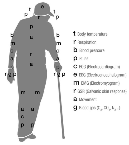 The sensing subsystem can contain different sensors for measuring biomedical signs of the wearer (Figure 5). The most suitable sensor location should consider stable positions that do not create artefact of movement or interactions with aids.