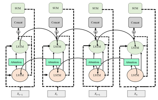 In the above equations, the weights throughout the parallel LSTM architecture, including the , ,, and parameters are employed to control and monitor the prior time step’s information concerning the hidden states along with ,, and , which are applied for the current input time steps’ weight matrices. The superscript indicates the input sequence information, the subscript displays the time step information, is used for the sigmoid function, and represents elementwise multiplication.
