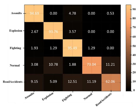 We experimentally assessed our proposed model using the benchmark anomaly detection UCF-Crime dataset [56]. To test the performance of the proposed paradigm, we experimentally evaluated it across numerous metrics, including the confusion matrix, F1 score, recall, precision, class-wise accuracy, area under curve (AUC), and receiver operating characteristic (ROC) curve. The performance of our model is compared with recent abnormal activity recognition techniques. The proposed model is implemented using Keras and backend TensorFlow with Python 3.6 on a Windows 10 platform and Corei5-6600 setup with 16-GB RAM, equipped with a 12-GB GeForce-Titan-X graphics processing unit (GPU).